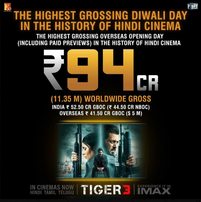 सलमान खान की फिल्म ने इंडिया में जहां 45 करोड़ से ओपनिंग की, तो वहीं पहले दिन वर्ल्डवाइड भी 'टाइगर-3' का खूब कहर बरसा। हाल ही में यशराज फिल्म्स ने अपने आधिकारिक ट्विटर अकाउंट पर फिल्म की कमाई का आंकड़ा शेयर किया। इस आंकड़ें को शेयर करते हुए मेकर्स ने बताया कि टाइगर 3 ने ग्लोबली पहले दिन पर ही 94 करोड़ के आसपास की कमाई कर ली है।