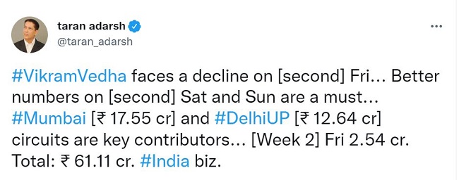 विक्रम वेधा ने दूसरे शुक्रवार को खबरों के अनुसार ढाई करोड़ रुपये कमाए हैं। इसके चलते इसकी 8 दिन की कुल कमाई 61.11 करोड़ रुपये के आसपास रही है। यह भी कहा जा रहा है कि दूसरे सप्ताह के वीकेंड पर यह फिल्म छह से आठ करोड़ रुपये का व्यापार कर सकती है।