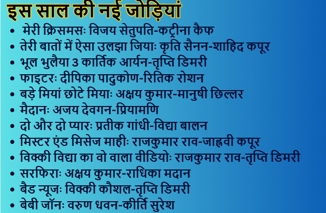 इस साल कटरीना कैफ व विजय सेतुपति पहली बार फिल्म ‘मेरी क्रिसमस’ में आए, लेकिन दर्शकों को लुभा नहीं पाए। ‘ऑपरेशन वैलेंटाइन’ में वरुण तेज और मानुषी छिल्लर की जोड़ी बनी, पर रंग नहीं जमा पाई। यह पुलवामा अटैक पर आधारित थी। फिल्म ‘कल्कि: 2898 एडी’ में दीपिका पादुकोण व प्रभास की जोड़ी ने जरूर धमाल मचाया। फिल्म ‘देवरा: पार्ट 1’ में जूनियर एनटीआर व जाह्नवी कपूर कमाल नहीं दिखा पाए। फिल्म ‘बेबी जॉन’ में वरुण धवन व कीर्ति सुरेश पहली बार नजर आए।