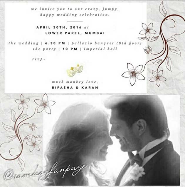 नई दिल्ली। पिछले काफी समय से प्यार की लुका-छिपी खेलने वाले बिपाशा बसु और करण सिंह ग्रोवर ने फाइनली शादी करने का फैसला कर ही लिया। दोनों ने एेलान कर दिया है कि 30 अप्रैल को शादी के बंधन में बंधने जा रहे हैं। फिलहाल तैयारियां जोरो पर हैं और सोशल मीडिया पर शादी का कार्ड भी सामने आ चुका है। अगर आपने अब तक नहीं देखा तो ये रहा आपके सामने बिपाशा और करण की शादी का कार्ड, जो उनकी जोड़ी की तरह ही काफी प्यारा लग रहा है। एक फैन क्लब ने यह वेडिंग कार्ड इंस्टाग्राम पर शेयर किया है।