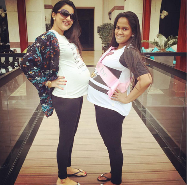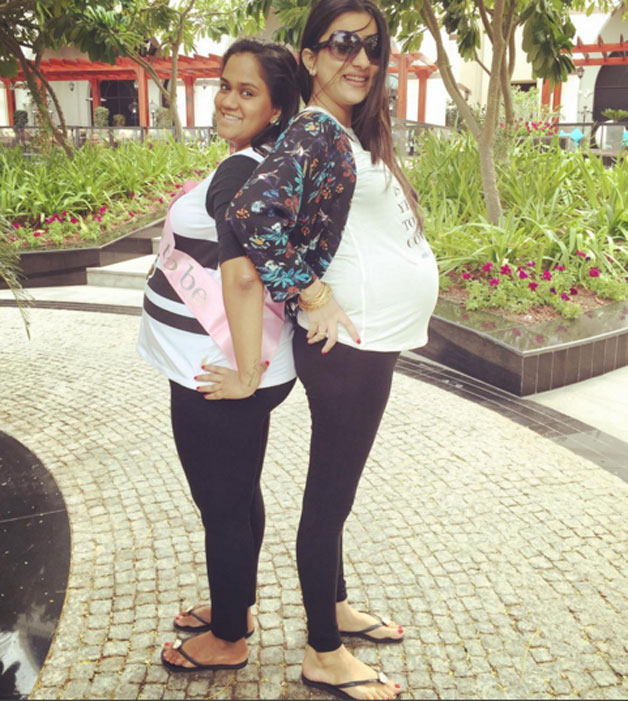 प्रेग्नेंट दोस्त के साथ ये एक और पोज। इन तस्वीरों से साफ है कि अर्पिता ने गोदभराई में खूब मस्ती की।