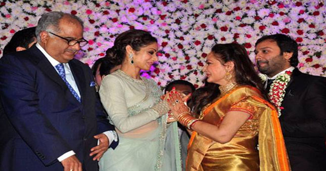 नई दिल्ली। आखिरकार 25 साल बाद अस्सी के दशक की दो खूबसूरत अभिनेत्रियों ने अपने बीच के सारे गिले-शिकवे भुला दिए और भरी महफिल में एक दूसरे को गला लिया। कल्पना कीजिए उस रोमांचक पल का, जिसे जया प्रदा के बेटे सिद्धार्थ की वेडिंग रिसेप्शन पार्टी में सभी ने सच होता देखा। श्रीदेवी ने भी अपने पति बोनी कपूर के साथ इसमें हिस्सा लिया और जब उनका सामना जया प्रदा से हुआ तो देखने वाले बस उन्हें देखते ही रह गए।