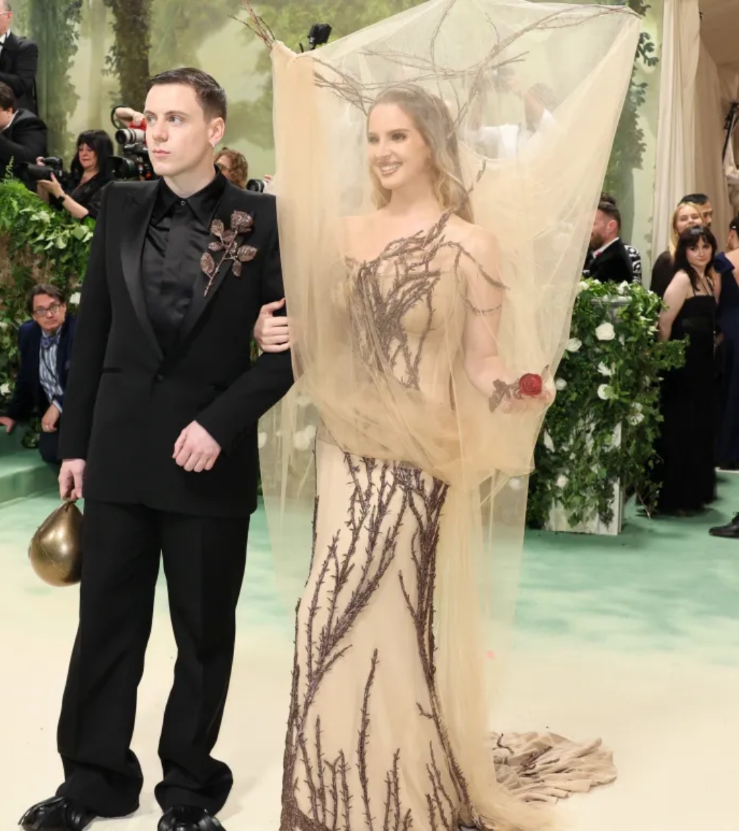 लाना डेल रे (Lana Del Rey) इस फैशन शो में बेज कलर की ड्रेस में नजर आई, जो पेड़ की तरह लग रही थी। गायक के हाथ में लाल गुलाब भी पकड़ा हुआ था।