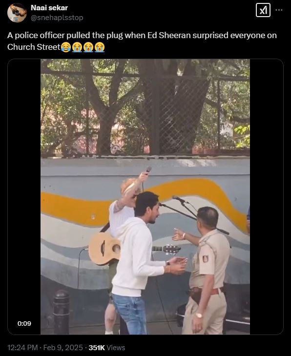 मशहूर सिंगर एड शीरन की परफॉर्मेंस को बेंगलुरु पुलिस ने बीच में ही रोक दिया, जिसके बाद से पुलिस की कार्रवाई चर्चा में बनी हुई है। इंडिया टुडे की खबर के अनुसार, बेंगलुरु पुलिस ने रविवार को चर्च स्ट्रीट पर एड शीरन के लाइव परफॉर्मेंस को रोक दिया। जबकि पहले से ही उनकी टीम ने इसके लिए अनुमति ली थी। इसके बाद भी मौके पर पहुंची पुलिस ऑफिसर्स ने इसके लिए इनकार कर दिया।
