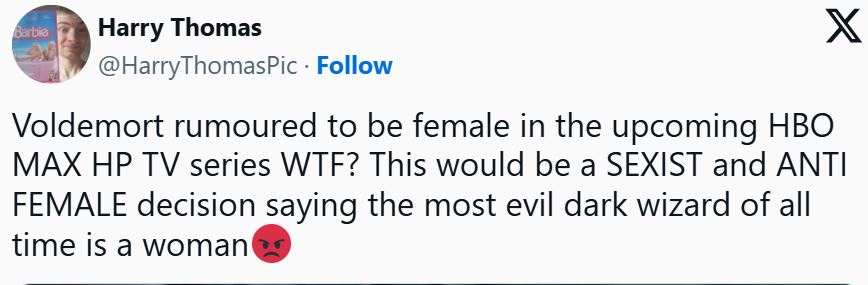 दूसरे यूजर ने लिखा, "मैं आपके सामने लेडी प्रेजेंट कर रहा हूं, जिसका नाम वोल्डेमॉर्ट नहीं होना चाहिए"। एक और अन्य यूजर ने लिखा, "एचबीओ के मैक्स एचपी टीवी सीरीज में एक महिला के वोल्डेमॉर्ट का किरदार निभाने की अफवाह आ रही है, ये क्या बकवास है?