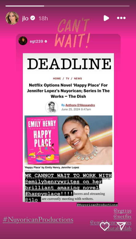 लोपेज ने अपनी इंस्टा स्टोरी पर आर्टिकल का स्क्रीनशॉट शेयर करते हुए अपनी आगामी सीरीज की जानकारी फैंस के साथ शेयर करते हुए कैप्शन में लिखा, "मैं इंतजार नहीं कर सकती"। जेनिफर ने आगामी वेब सीरीज 'हैप्पी प्लेस' के लिए नेटफ्लिक्स के साथ साझेदारी की है।