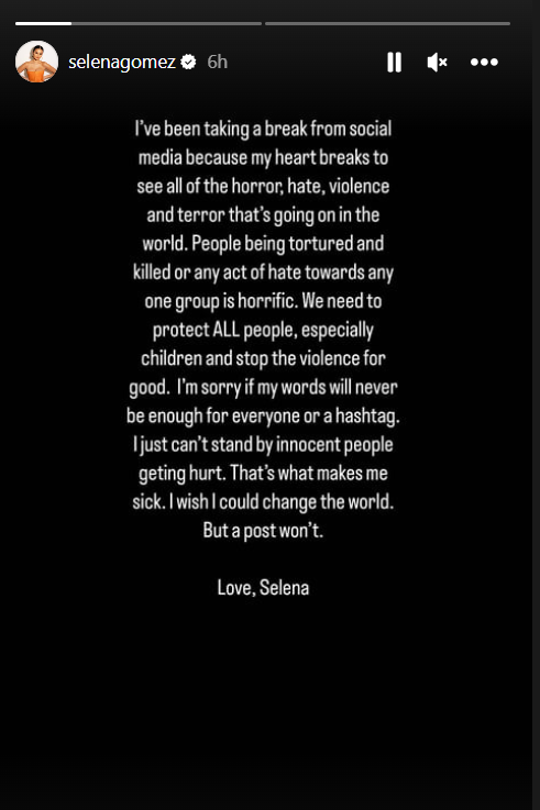 ऐसे में अब इंस्टाग्राम स्टोरी पर एक पोस्ट साझा किया जिसमें लिखा है- मैं सोशल मीडिया से ब्रेक ले रही हूं क्योंकि दुनिया में जो भयावहता, नफरत, हिंसा और आतंक चल रहा है उसे देखकर मेरा दिल टूट रहा है। हमें सभी लोगों, खासकर बच्चों की रक्षा करने और हिंसा को हमेशा के लिए रोकने की जरूरत है। मुझे खेद है अगर मेरे शब्द कभी भी हर किसी या हैशटैग के लिए पर्याप्त नहीं होंगे। मैं निर्दोष लोगों को चोट पहुंचाते हुए बर्दाश्त नहीं कर सकती। यहीं मुझे बीमार बनाता है। काश मैं दुनिया बदल पाती।