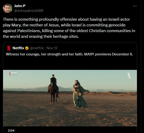 इजरायल और फिलिस्तीन के बढ़ते विवाद की वजह से 'मैरी' की बायोपिक सुर्खियों में आ गई है। सोशल मीडिया पर कई लोग इस बात पर आपत्ति जता रहे हैं कि एक इजरायली एक्ट्रेस को फिल्म में क्यों कास्ट किया गया है। एक यूजर ने लिखा, "एक इजरायली एक्ट्रेस यीशु की मां मैरी का रोल प्ले कर रही है, ये बहुत ही अपमानजनक है, क्योंकि हम सब जानते हैं कि इजरायल फिलिस्तीनियों का नरसंहार कर रहा है। उन्होंने कुछ पुराने क्रिश्चिन समुदायों को खत्म कर दिया है। वह उनकी विरासत को मिटा रहे हैं"।