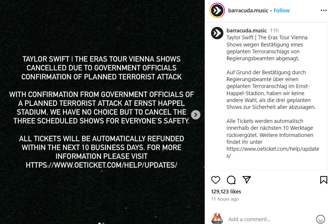 ऑस्ट्रिया के शो प्रमोटर, बाराकुडा ने टेलर स्विफ्ट के शो के कैंसिल होने की जानकारी इंस्टाग्राम पोस्ट के जरिए शेयर की है, जिसमें लिखा गया है-