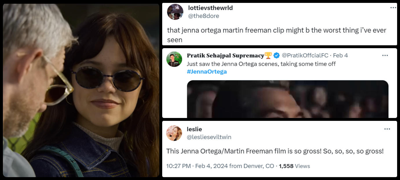 जेना ओरटेगा (Jenna Ortega) और मार्टिन फ्रीमैन (Martin Freeman) की फिल्म मिलर्स गर्ल (Millers Girl) जनवरी में रिलीज हुई थी। जेड हेली बार्टलेट ने फिल्म का निर्देशन किया है। जेना एक स्टूडेंट के किरदार में हैं मार्टिन फ्रीमैन उनके टीचर बने हैं। इस ब्लैक कॉमेडी की कहानी इन दोनों की रिलेशनशिप पर आधारित है। फिल्म को क्रिटिक्स का सपोर्ट भी नहीं मिला और अब सोशल मीडिया में लोग नाराज हैं।