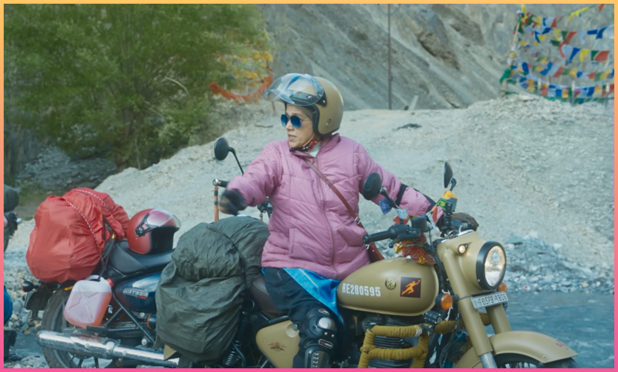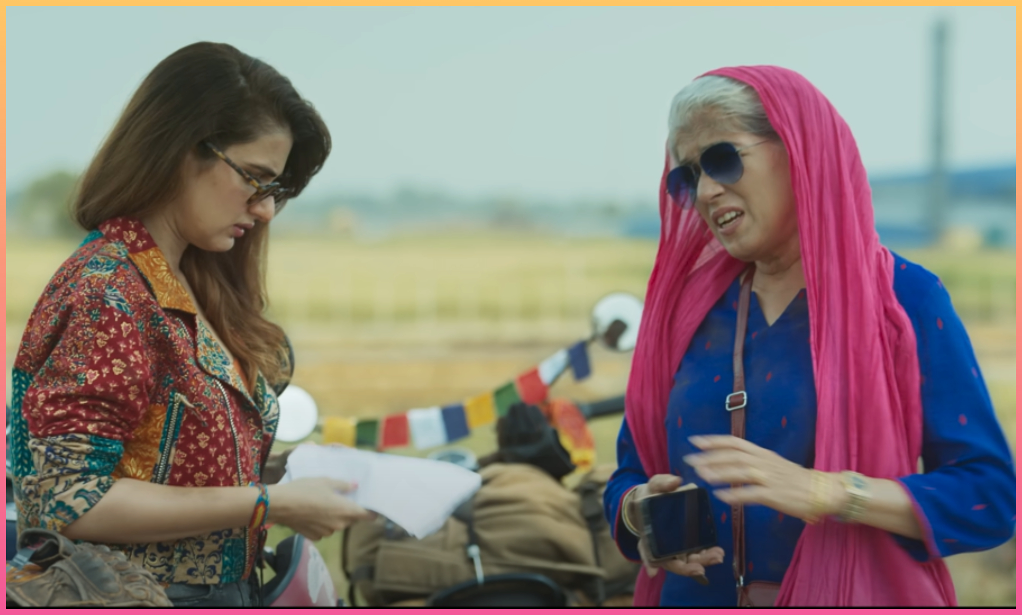 बाइक से लेह जाना है, आपके साथ कोई जेंट्स तो जा रहा होगा ना... यह उस सोच पर प्रहार करता है, जहां महिलाओं को पुरुषों के अधीन माना जाता है। उम्रदराज महिला का खुद को अपने बच्चों और पोते-पोतियों के सामने साबित करने की जद्दोजह को रत्ना पाठक शाह सच्चाई से निभाती हैं।