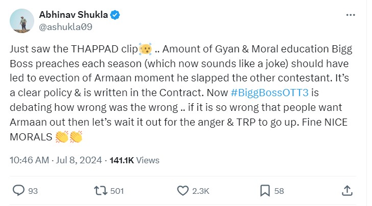अभिनव शुक्ला ने कहा, "अभी-अभी थप्पड़ वाली क्लिप देखी... बिग बॉस हर सीजन में जितना ज्ञान और नैतिक शिक्षा देता है (जो अब मजाक जैसा लगता है) उसके हिसाब से अरमान को उसी पल बाहर कर देना चाहिए था जब उसने दूसरे कंटेस्टेंट को थप्पड़ मारा था। ये एक स्पष्ट नीति है और कॉन्ट्रैक्ट में लिखी हुई है। अब बिग बॉस ओटीटी 3 को लेकर इस बात पर बहस चल रही है कि गलत कितना गलत था.. अगर ये इतना गलत है कि लोग अरमान को बाहर करना चाहते हैं तो चलिए गुस्से और टीआरपी के बढ़ने का इंतजार करते हैं। ठीक है बढ़िया नैतिकता है।"
