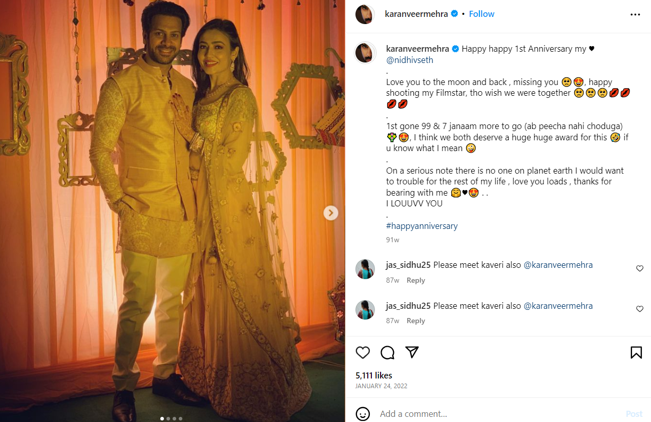 करण वीर मेहरा और निधि ने साल 24 जनवरी साल 2021 में परिवार और दोस्तों के बीच दिल्ली के एक गुरुद्वारे में फेरे लिए थे। करण और निधि की मैरिज लाइफ में कुछ महीनों से दिक्कत चल रही थी, जिसके चलते इस कपल ने अलग होने का फैसला लिया।