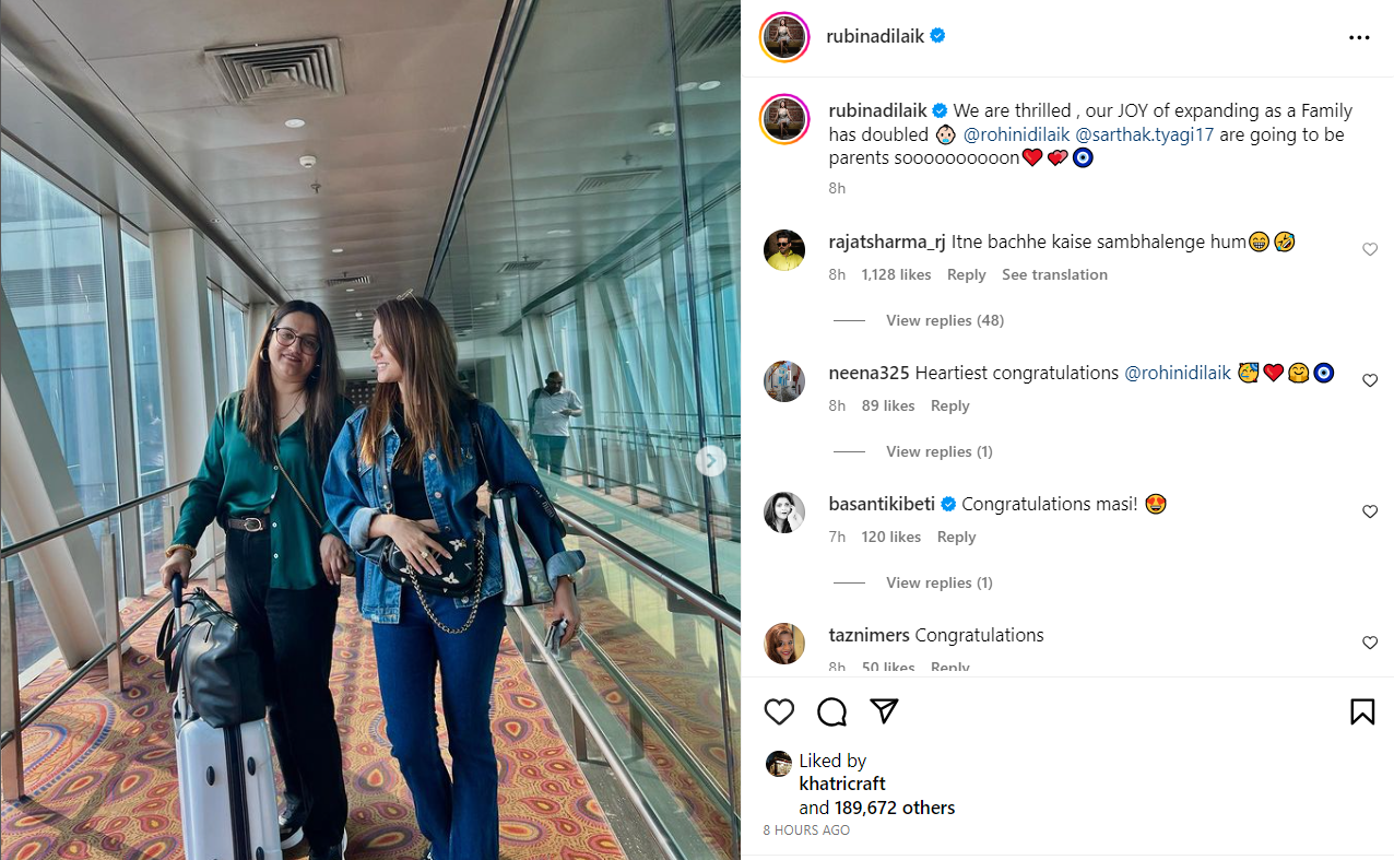 दरअसल, रुबीना दिलैक की बड़ी बहन रोहिणी दिलैक भी मां बनने वाली हैं। इन दिनों रोहिणी भी अपनी प्रेग्नेंसी एन्जॉय कर रही हैं। इसकी जानकारी एक्ट्रेस ने सोशल मीडिया पर साझा की है। रुबीना ने इंस्टाग्राम पर बड़ी बहन की कुछ तस्वीरे शेयर की हैं और कैप्शन में लिखा- हम बहुत खुश हैं। हमारी फैमिली में खुशियां डबल होने वाली हैं। रोहिणी दिलैक जल्द ही मां बनने वाली हैं। बता दें, रुबीना की बहन रोहिणी की शादी इसी साल मई में सार्थक त्यागी के साथ हुई है।