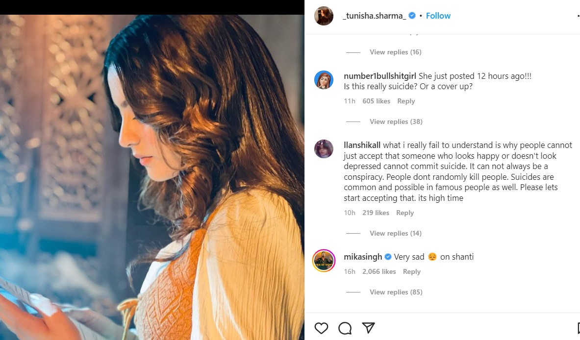 तुनिषा शर्मा के आखिरी पोस्ट पर कई फैंस और सेलेब्स ने कमेंट किया है। एक यूजर ने लिखा, 'मैं यह समझ नहीं पा रहा हूं कि एक व्यक्ति जो खुश लगता है या जो कम परेशान नजर आता है, वह डिप्रेशन में नहीं हो सकता। हमेशा किसी की मौत कॉन्सपिरेसी नहीं हो सकती। कोई किसी को भी ऐसे ही नहीं मार सकता। आत्महत्या कॉमन है और फेमस लोगों के साथ भी यह हो सकता है। समय आ गया है कि हम सब इस बात को स्वीकार कर लें।'
