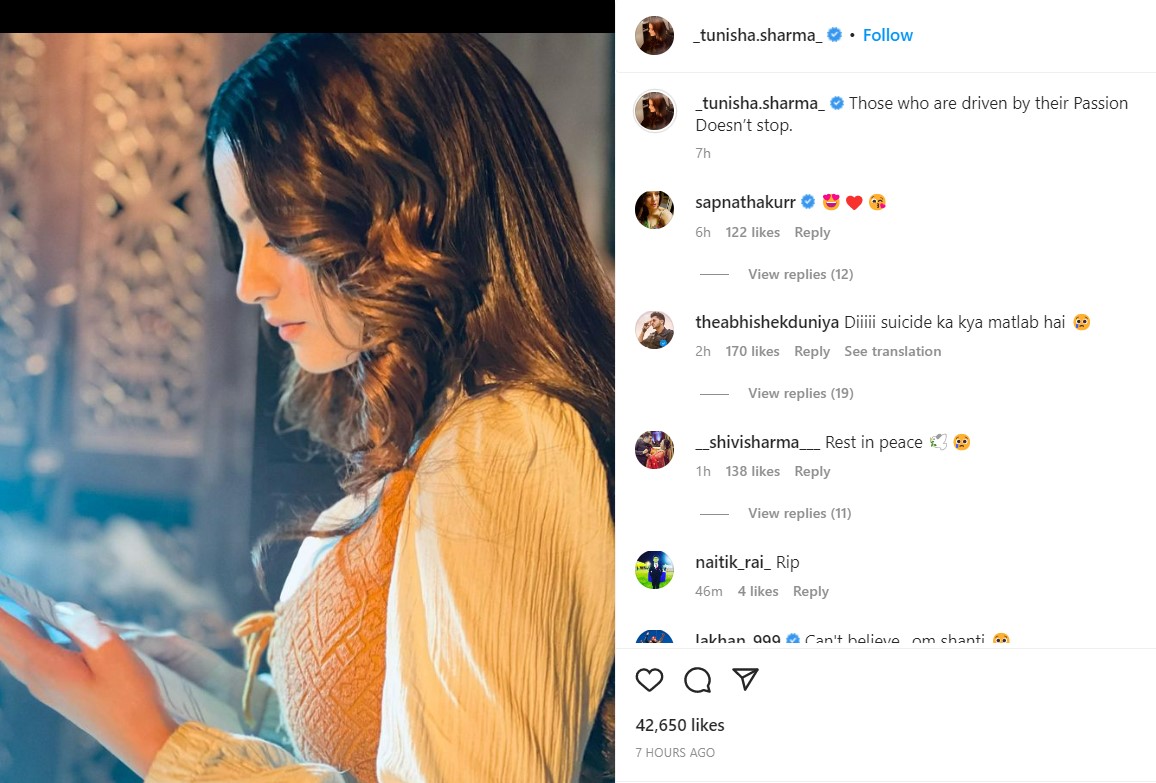 तुनिषा शर्मा के सुसाइड करने की आधिकारिक जानकारी सामने नहीं आई है। ऐसे में हर कोई उनकी मौत से सन्न है। फैंस यकीन नहीं कर पा रहे कि छह घंटे में ऐसा क्या हुआ होगा, जो उन्होंने अपनी जिंदगी खत्म करने का फैसला कर लिया। मौत से छह घंटे पहले तुनिषा ने स्क्रिप्ट पढ़ते हुए अपनी एक तस्वीर शेयर की, जिसके कैप्शन में उन्होंने लिखा- 'जो लोग अपने जुनून से प्रेरित होते हैं, वो कभी रुकते नहीं।'