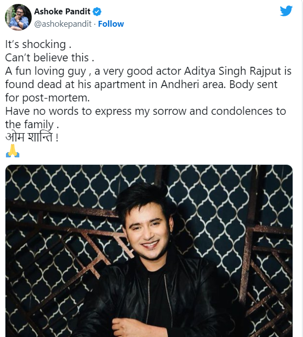 फिल्ममेकर अशोक पंडित ने भी आदित्य के निधन पर हैरानी जताई है। उन्होंने सोशल मीडिया पोस्ट में लिखा, "यह शॉकिंग है। विश्वास नहीं हो रहा है। एक फन लविंग लड़का, एक बहुत अच्छा एक्टर अपने अंधेरी स्थित अपार्टमेंट में मृत पाया गया। बॉडी को पोस्टमार्टम के लिए भेज दिया गया है। मेरे पास अपना दुख जाहिर करने और परिवार को संवेदना देने के लिए कोई शब्द नहीं है।"