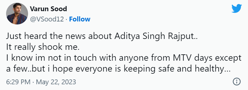 'स्प्लिट्सविला' फेम आदित्य सिंह राजपूत के निधन पर एक्टर वरुण सूद ने ट्विटर पर रिएक्शन दिया है। वरुण सूद ने ट्वीट किया है, "आदित्य सिंह राजपूत को लेकर ये खबर सुनी। इसने मुझे हिला दिया है। मुझे पता है कि मैं कुछ लोगों को छोड़कर एमटीवी डेज के एक्टर्स के साथ टच में नहीं था, लेकिन मैं उम्मीद करता हूं कि हर कोई सेफ और हेल्दी है।"