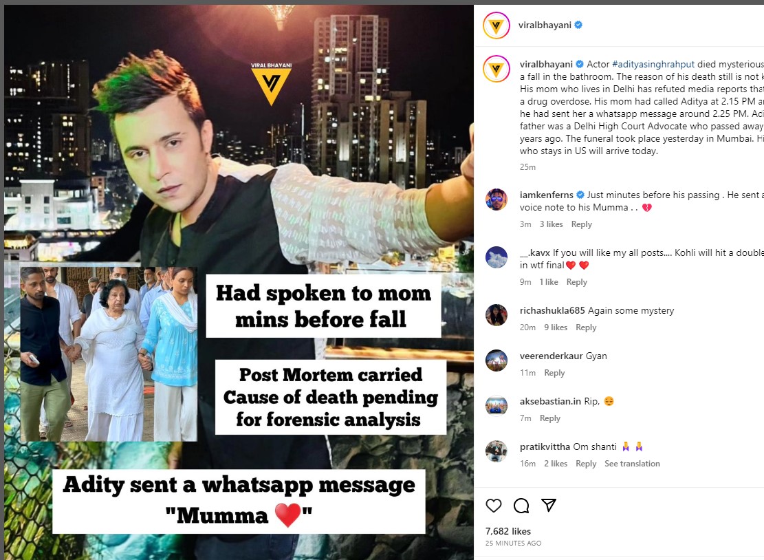 सेलिब्रिटी फोटोग्राफर विरल भयानी ने आदित्य सिंह राजपूत की मौत से जुड़ा एक पोस्ट शेयर किया है। आदित्य की मौत की वजह ड्रग ओवरडोज बताई जा रही थी, जिससे उनकी मां ने इनकार कर दिया। विरल की शेयर की गई पोस्ट के मुताबिक, मौत से कुछ समय पहले आदित्य ने अपनी मां से बात की थी। सोमवार को दोपहर करीब 2.15 बजे उनकी मां ने उन्हें कॉल किया था। इसके बाद 2.25 पर आदित्य ने उन्हें व्हाट्सएप पर मेसेज किया। यह उनकी आखिरी बात थी।