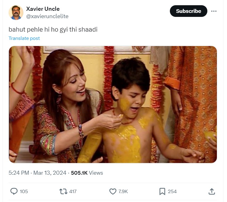 'बबीता जी' और 'टप्पू' की ये फोटो तब की है जब शो में 'टप्पू' की शादी करवाई जा रही थी। एक्स को फोटो शेयर करते फैंस ने कमेंट करते हुए कहा- "बहुत पहले ही हो गई शादी।" मुनमुन दत्ता और राज अनादकट की सगाई की अफवाहों के बीत 'बबीता जी' और 'टप्पू' का ये फोटो वायरल हो रहा है।