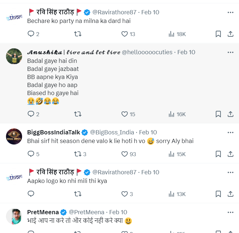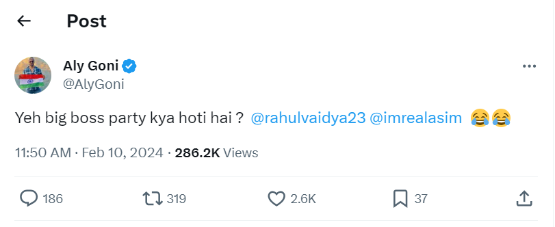 शनिवार को अली गोनी (Aly Goni) ने एक्स (X) अकाउंट पर ट्वीट करते हुए एक पोस्ट करते हुए लिखा, ये बिग बॉस पार्टी क्या होती है? इस पोस्ट में उन्होंने उस राहुल वैद्य और आसिम को टैग भी किया। इस पोस्ट पर निक्की तंबोली ने कमेंट करते हुए लिखा, फेक इट टू मेक इट। तुम मेरा मतलब समझ सकते हो।