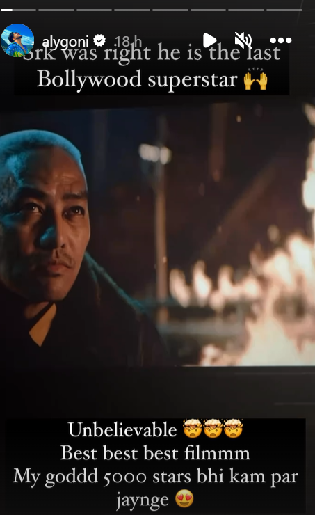 इसके बाद उन्होंने इंस्टाग्राम पर, फिल्म का एक वीडियो शेयर किया और उस पर लिखा 'एसआरके सही थे, वह आखिरी बॉलीवुड सुपरस्टार हैं, अविश्वसनीय। बेस्ट, बेस्ट, बेस्ट फिल्म, इसके लिए 5000 स्टार्स भी कम पड़ जाएंगे'।