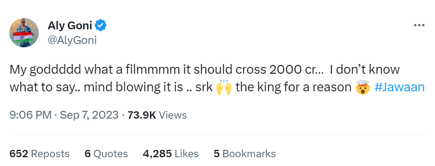'ये है मोहब्बतें', 'बिग बॉस' जैसे कई सीरियल में नजर आ चुके अभिनेता अली गोनी ने फिल्म की तारीफ करते हुए ट्विटर पर एक ट्वीट किया। ट्वीट करते हुए उन्होंने लिखा 'हे भगवान, क्या फिल्म है, इसे 2000 करोड़ के पार जाना चाहिए। मुझे नहीं पता कि क्या कहूं, दिमाग हिला देने वाली फिल्म है। एसआरके, इसी वजह से किंग हैं'।