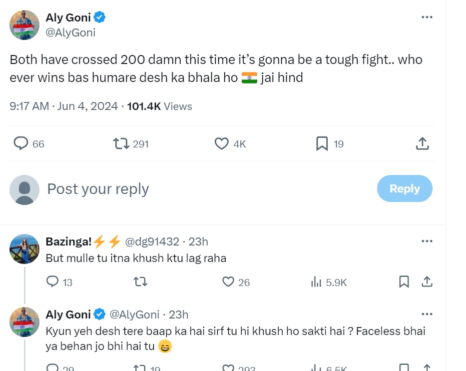अली गोनी ने यूजर को रिप्लाई में लिखा, 'अब इसी को जवाब देते उन्होंने लिखा, 'क्यों देश तेरे बाप का है, सिर्फ तू ही खुश हो सकती है? फेसलेस भाई या बहन जो भी है तू।' इसके साथ हंसने वाली इमोजी भी पोस्ट की।