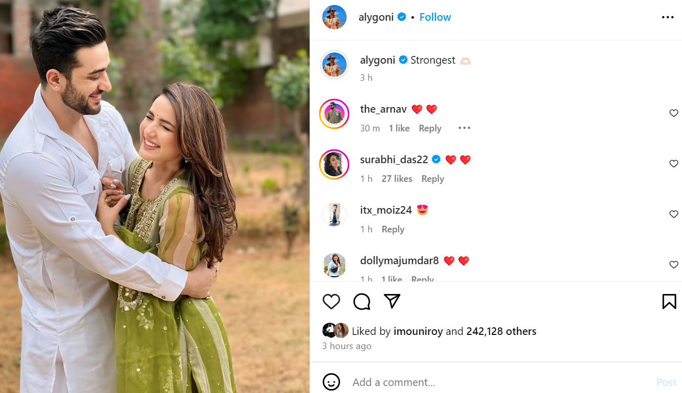 अली गोनी ने अपने सोशल मीडिया हैंडल इंस्टाग्राम पर एक पोस्ट किया है। इस पोस्ट में वह जैस्मिन को अपनी बाहों में पकड़े नजर आ रहे हैं और दोनों स्माइल कर रहे हैं। अली जहां व्हाइट कुर्ते पजामे में दिखाई दे रहे हैं। वहीं, एक्ट्रेस ग्रीन सूट में नजर आ रही हैं। इस फोटो को शेयर करते हुए उन्होंने कैप्शन में 'मजबूत' लिखा है।