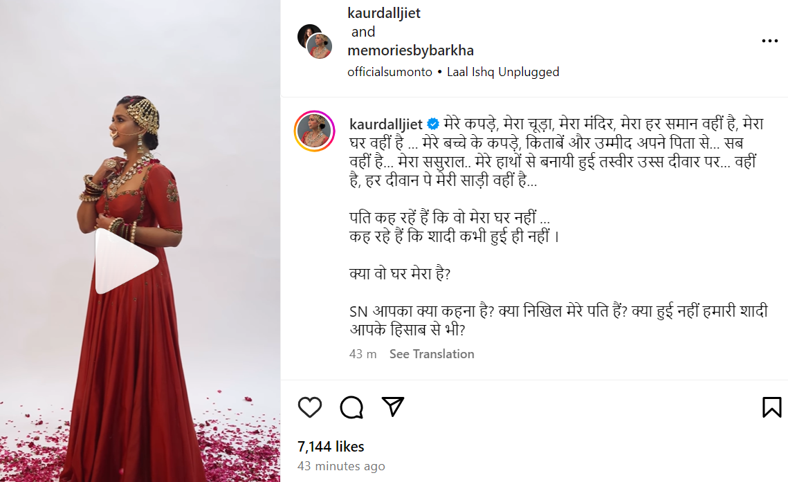 मेरा ससुराल, मेरे हाथों से बनाई हुई तस्वीर उस दीवार पर वहीं है। हर दीवार पे मेरी साड़ी है। बता दें कि दलजीत कौर और निखिल की यह दूसरी शादी थी। इससे पहले एक्ट्रेस ने उन्होंने बिग बॉस कंटेस्टेंट शालीन भनोट से शादी रचाई थी। साल 2015 में अभिनेत्री ने उन पर घरेलू हिंसा का आरोप लगाने के बाद तलाक ले लिया था।
