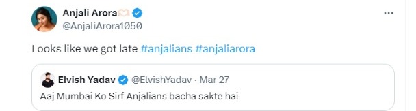 उनके इस ट्वीट के बाद एल्विश यादव भी उन पर जुबानी हमला करने से पीछे नहीं हटे और उन्होंने अंजलि अरोड़ा का नाम लिए बिना ही उन पर वार किया। अब अंजलि अरोड़ा ने एल्विश यादव के तंज का अंजलि ने मुंह तोड़ जवाब देते हुए एक ट्वीट कर लिखा, "ऐसा लग रहा है हम लेट हो गए हैं"।