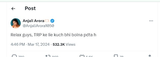 अब हाल ही में इस विवादित मामले के बीच में ही अंजलि अरोड़ा ने ऐसा ट्वीट किया है, जिसे एल्विश यादव से यूजर्स जोड़ रहे हैं। ट्वीट करते हुए अंजलि अरोड़ा ने लिखा, "रिलेक्स गाइज, टीआरपी के लिए कुछ भी बोलना पड़ता है"। हालांकि, अंजलि ने इस ट्वीट में किसी का नाम मेंशन नहीं किया है।