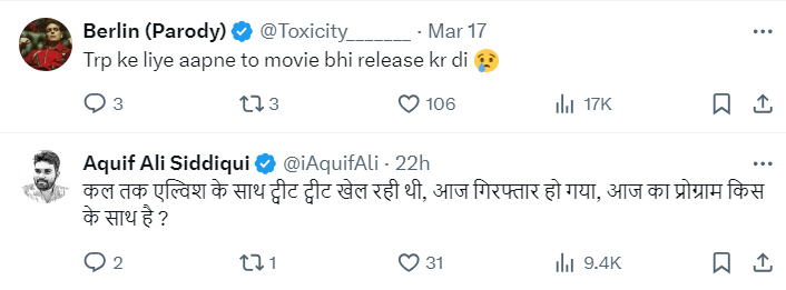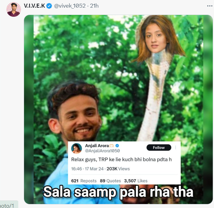आज वो गिरफ्तार हो गया है, तो किसके साथ ट्वीट-ट्वीट हो रहा है"। एक अन्य यूजर ने लिखा, "आपने एल्विश को भी धोखा दे दिया"। एक यूजर ने तो मीम शेयर किया, जिस पर एल्विश यादव और अंजलि की फोटो है। इस फोटो के नीचे लिखा है, "सांप पाल रहा था"।