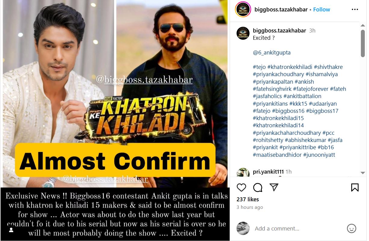 पेज का दावा है कि अभिनेता को लगभग कंफर्म कर लिया गया है। मगर मेकर्स की तरफ से फिलहाल कोई ऑफिशियल लिस्ट जारी नहीं किया गया है। जानकारी के लिए बता दें कि अंकित को इससे पहले वाले सीजन के लिए भी अप्रोच किया गया था। उस वक्त वो एक शो में काम कर रहे हैं जिस कारण वो रोहित के शो का हिस्सा नहीं बन पाए थे।