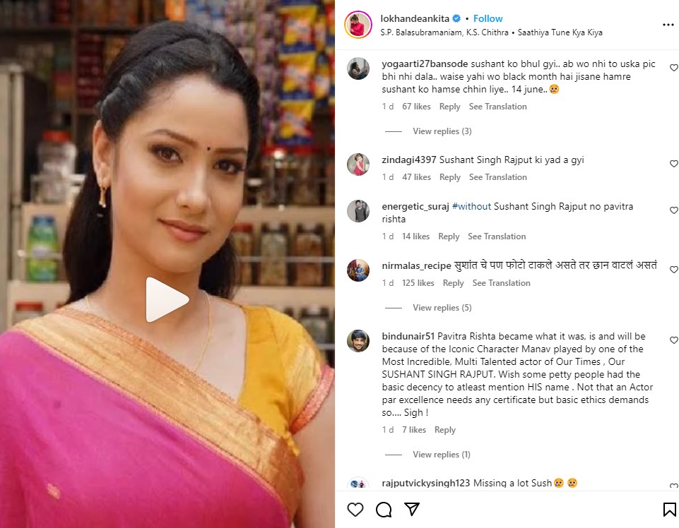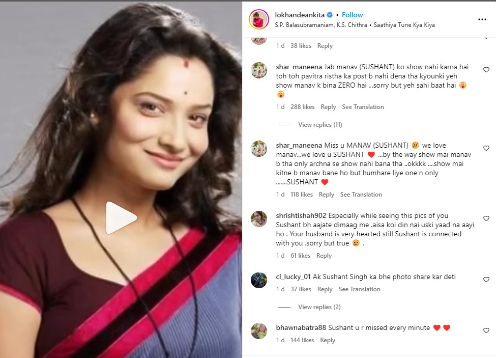 अंकिता लोखंडे के वीडियो पर कमेंट करते हुए एक यूजर ने कहा, "जब मानव (सुशांत) को दिखाना नहीं था तो पवित्र रिश्ता का पोस्ट भी नहीं देना था, क्योंकि ये शो मानव के बिना जीरो है...माफ करना, लेकिन यही सच है।"