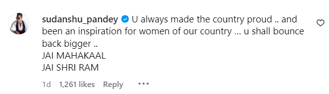 स्मृति ईरानी द्वारा शेयर की गयी तस्वीर के नीचे सुधांशु पांडे ने एक्ट्रेस का हौसला बढ़ाते हुए लिखा, "आपने इस देश का गौरव हमेशा बढ़ाया है और महिलाओं के लिए आप एक बहुत बड़ी प्रेरणा रही हैं। आप और भी ज्यादा मजबूती के साथ वापस लौटेंगी, जय महाकाल-जय श्री राम"। सुधांशु पांडे के अलावा टीवी एक्ट्रेस आशका गोराड़िया ने भी लिखा, हम आपके साथ हैं, कोई भी हार आपको नहीं रोक सकती"।