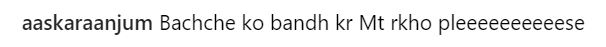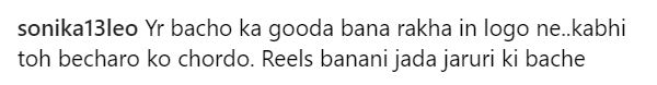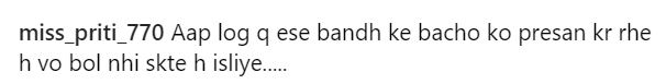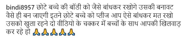 बेटी को स्वैडल में बांधने पर लोग कृतिका मलिक पर भड़क गए और कमेंट बॉक्स में अरमान की वाइफ की क्लास लगाने लगे। एक यूजर ने लिखा, "छोटे बच्चे की बॉडी को बांधकर रखोगे, उसकी बनावट वैसे ही बन जाएगी। इतने छोटे बच्चे को प्लीज आप ऐसे बांधकर मत रखो। उसको खुला रहने दो, वीडियो के चक्कर में बच्चों के साथ आप खिलवाड़ कर रहे हो।"