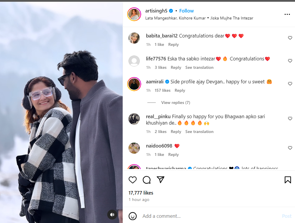 दूसरे यूजर ने लिखा, "ये साइड से अजय देवगन लग रहा है"। एक्टर आमिर अली ने लिखा, "साइड प्रोफाइल अजय देवगन..तुम्हारे लिए खुश हूं"। कई फैंस बिग बॉस कंटेस्टेंट का सपना पूरा होने के लिए उन्हें बधाई दे रहे हैं और उनके लिए अच्छी मैरिड लाइफ की कामना कर रहे हैं।
