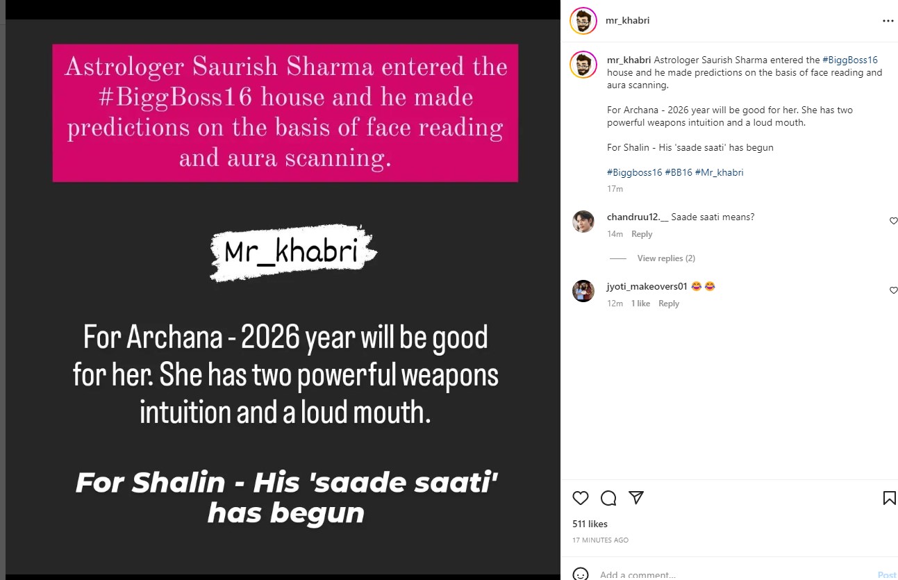 मिस्टर खबरी द्वारा दी गई जानकारी के अनुसार, एस्ट्रोलॉजर सॉरिश शर्मा बिग बॉस में एंट्री लेने वाले हैं। वह सभी कंटेस्टेंट्स का चेहरा पढ़कर बताएंगे कि किसका अच्छा समय चल रहा है और किसका आने वाला समय कैसा होगा। उन्होंने अर्चना के लिए प्रेडक्ट किया कि साल 2026 उनके लिए बहुत अच्छा होने वाला है। उनका बड़बोलापन और स्ट्रॉन्ग इंट्यूशन ही उनकी सबसे बड़ी ताकत है।