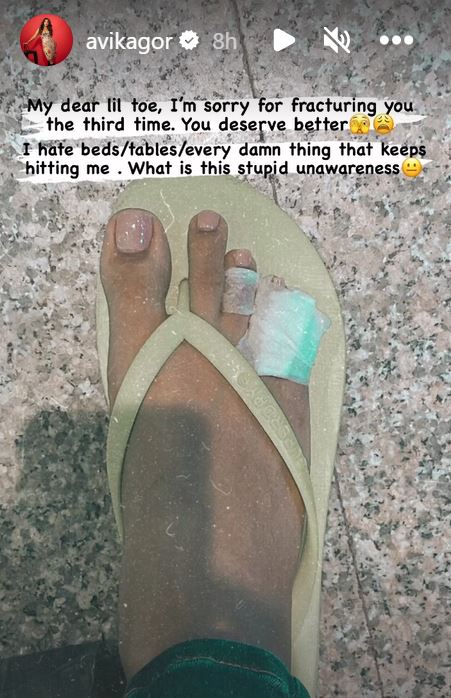 अविका गौर ने अपनी इंस्टाग्राम स्टोरी पर पैर की तस्वीर शेयर की है, जिसमें उनके पैर की दो अंगुलियों में फ्रैक्चर हो गया है। पिक्चर शरीर करते हुए अविका ने यह भी बताया कि तीसरी बार उनकी पैर की अंगुली फ्रैक्चर हुई है। अविका की ये तस्वीर फैन पेज पर देखने को मिल रही है, जहां उनके फैंस काफी परेशान नजर आए।