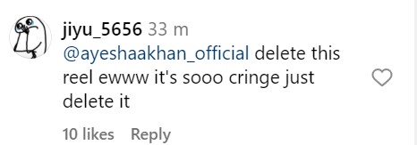 आयशा खान के लेटेस्ट वीडियो को लेकर उन्हें टारगेट करते हुए एक यूजर ने कमेंट कर लिखा- फॉलोअर्स बढ़ाने का ये तरीका थोड़ा कैजुएल है। दूसरे यूजर ने नाराजगी व्यक्त करते हुए कहा है- तुरंत के तुरंत इस वीडियो को डिलीट कर दो। एक ने तो अयाशा को अनफॉलो करने की धमकी भी दे डाली है।