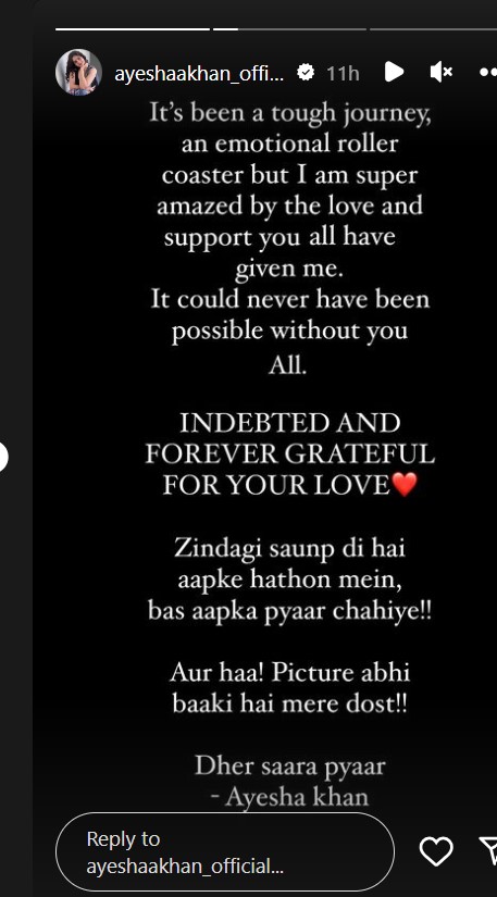 आयशा ने आगे एक शायरी भी लिखी, 'जिंदगी सौंप दी है आपके हाथों में, बस आपका प्यार चाहिए!!' इसी के साथ उन्होंने लास्ट में एक ऐसी बात लिखी, जिससे यूजर्स ने कयास लगाया है कि आने वाले दिनों में वह मुनव्वर को लेकर और भी खुलासे करने वाली हैं। आयशा ने लिखा, 'पिक्चर अभी बाकी है मेरे दोस्त।'