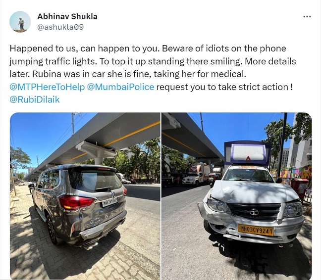 "यह आज होना था। यह किसी के भी साथ हो सकता है। ऐसे बेवकूफ से बचे जो ट्रेफिक लाइट पर फोन पर बात करते हुए सिग्नल जंप करते हैं और वहां खड़े होकर मुस्कुराते रहते हैं। बाकी जानकारियां जल्द दूंगा। रुबीना कार में थी लेकिन वह ठीक है। उनका मेडिकल हो रहा है।"