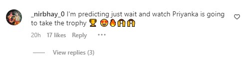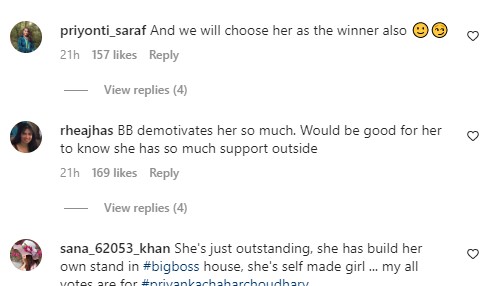 अंकित गुप्ता से लड़ाई होने के बाद प्रियंका घर में थोड़ी परेशान हो गई थीं, लेकिन बिग बॉस के समझाने के बाद प्रियंका एक बार फिर से पूरे फॉर्म में आ गई हैं। सोशल मीडिया पर भी प्रियंका का अंदाज दर्शकों को खूब पसंद आ रहा है। एक यूजर ने कमेंट करते हुए लिखा, 'हम उन्हें सिर्फ क्वीन ही नहीं, बल्कि बिग बॉस के विनर के रूप में भी चुनते हैं'। दूसरे यूजर ने लिखा, 'बिग बॉस ने उन्हें बहुत ज्यादा डिमोटिवेट किया है। ये उनके लिए अच्छा होगा अगर उन्हें ये पता होगा कि बाहर से उन्हें कितना ज्यादा सपोर्ट मिल रहा है'। एक अन्य यूजर ने लिखा, 'प्रियंका बहुत शानदार है। उन्होंने बिग बॉस के घर में खुद को खड़ा किया है। मेरे सभी वोट्स प्रियंका चहर चौधरी के लिए हैं'। सोशल मीडिया पर लोग एक्ट्रेस पर प्यार लुटाने से बिलकुल भी पीछे नहीं हट रहे हैं।