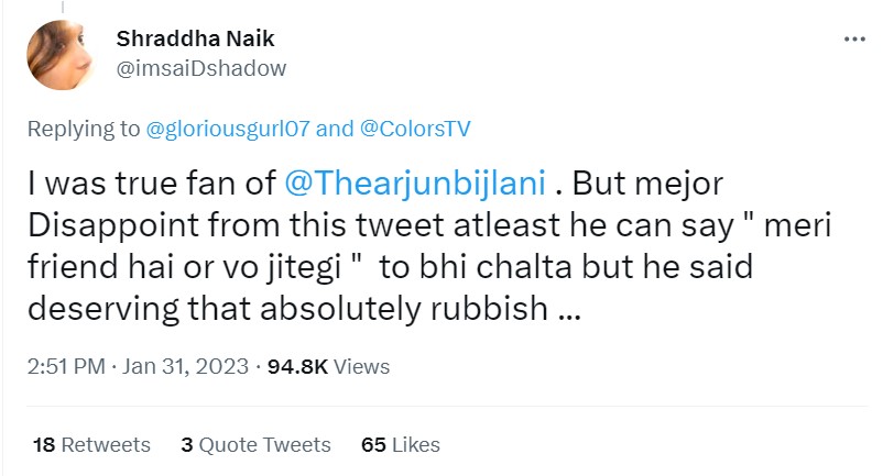 एक अन्य यूजर ने कहा, "मैं अर्जुन बिजलानी की असली फैन हूं। लेकिन ये ट्वीट निराशाजनक है। आप कम से कम ये कह सकते थे कि दोस्त है वो मेरी और वो ही जीतेगी, तो भी चलता, लेकिन उन्होंने कहा कि वो डिजर्विंग है, जो बिल्कुल बकवास है।"