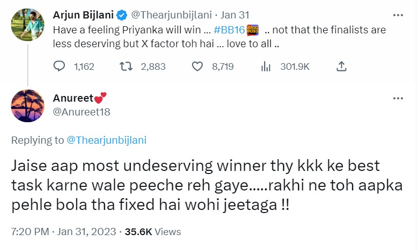 Bigg Boss 16: प्रियंका को विनर बताने पर अर्जुन बिजलानी हुए ट्रोल, लोग बोले- फिक्सिंग करके तूने KKK11 जीता अब..