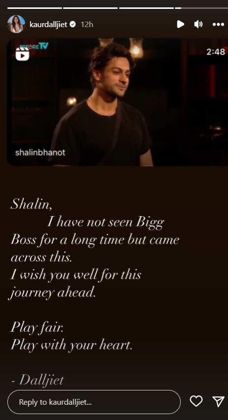 दलजीत कौर ने अपने ऑफिशियल इंस्टाग्राम अकाउंट के इंस्टा स्टोरी सेक्शन में बिग बॉस से शालीन की चिट्ठी मिलने के बाद इमोशनल वीडियो शेयर किया और कहा, ''शालीन, मैंने बहुत समय से बिग बॉस नहीं देखा है, लेकिन मैंने इस वीडियो को देखा। मैं आपको इस सफर के लिए शुभकामनाएं देती हूं। ईमानदार होकर खेलो। अपने दिल के साथ खेलो।"