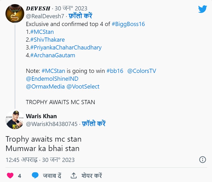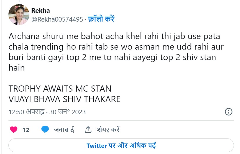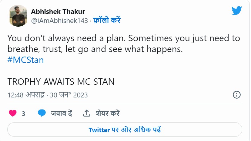 एक अन्य यूजर ने रैंकिंग जारी करते हुए कहा कि एमसी स्टैन ही शो जीतेंगे।