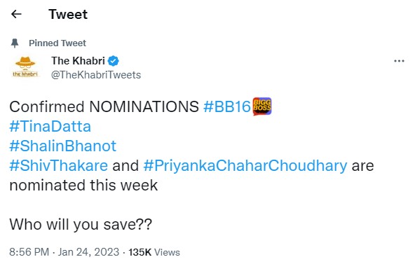 शिव ठाकरे ने टीना दत्ता को ये कहते हुए नॉमिनेट किया कि वह शालीन के डिप्रेशन का मजाक बनाती हैं और उनमें इंसानियत नहीं है, तो वही शालीन ने भी टीना और प्रियंका पर ही निशाना साधा। आठ सदस्यों में से जिन चार सदस्यों पर इस हफ्ते नॉमिनेशन की गाज गिरी, उसमें शिव ठाकरे, टीना दत्ता, शालीन भनोट और प्रियंका चहर चौधरी का नाम शामिल है।