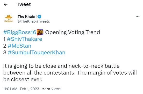 मिस्टर खबरी ने अपने ट्विटर अकाउंट पर ये जानकारी शेयर की है कि अपने पसंदीदा कंटेस्टेंट को सुरक्षित करने के लिए फैंस धड़ाधड़ वोट्स कर रहे हैं और उन्होंने इस हफ्ते जिस कंटेस्टेंट को सबसे ज्यादा वोट्स दिए हैं, वह शिव ठाकरे हैं।